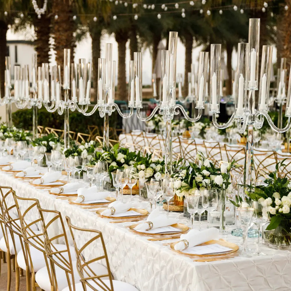 Elevate any venue with our elegant chandelier rentals. Choose from crystal chandeliers, candelabra-style arms, and gemcut designs.